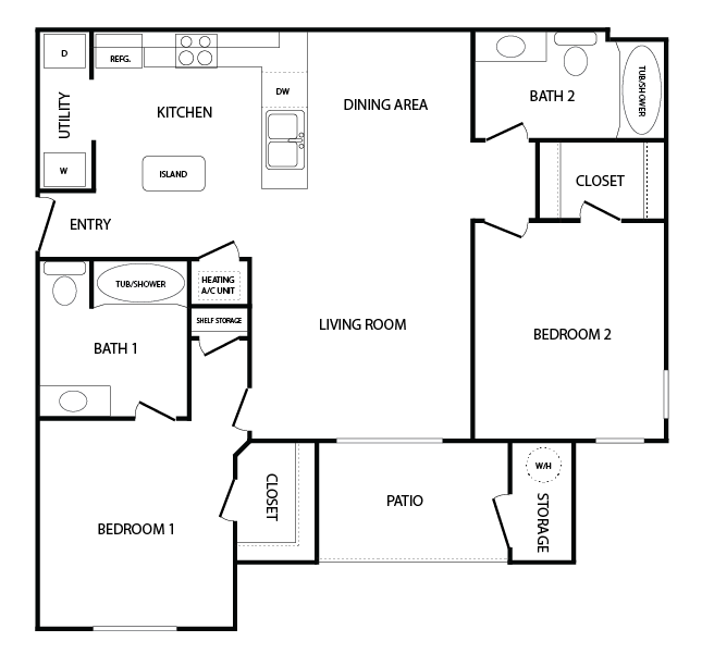 TWO BEDROOM / TWO BATH - 1,000 SQ FT