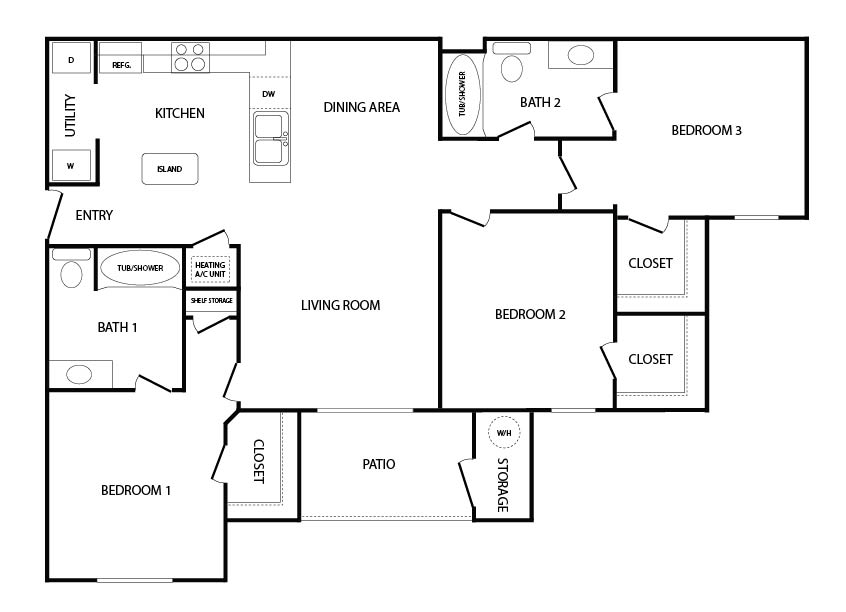 THREE BEDROOM / TWO BATH - 1,206 SQ FT